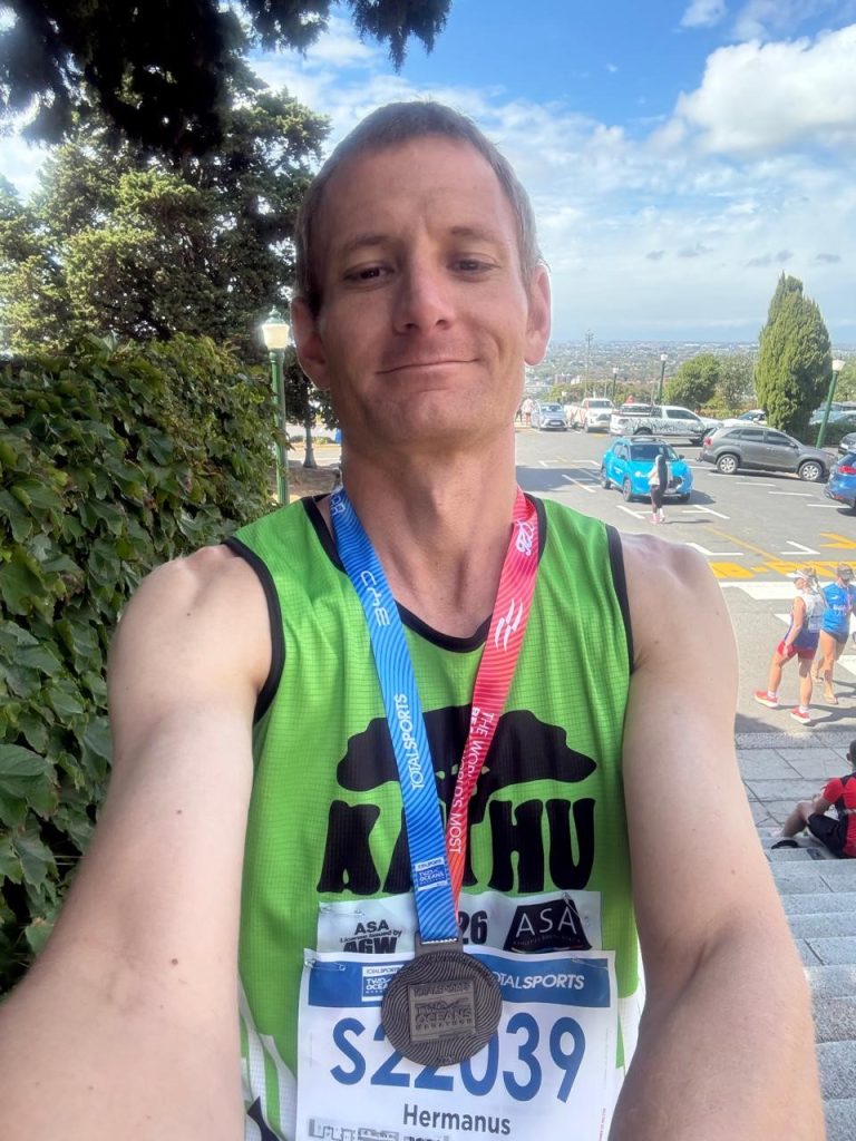 Ramon Titus en Manie Steyn het die 56km van die Ultra Marathon onderskeidelik voltooi in 5:54:25 en 6:10:40.